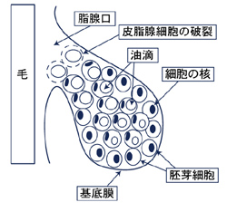 管の底は丸い巣状で、脂腺細胞の中で皮脂は作られます。